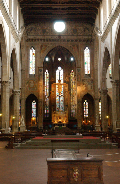 The inside of the church is spacious and decorated with frescoes by Giotto and his student Gaddi. |