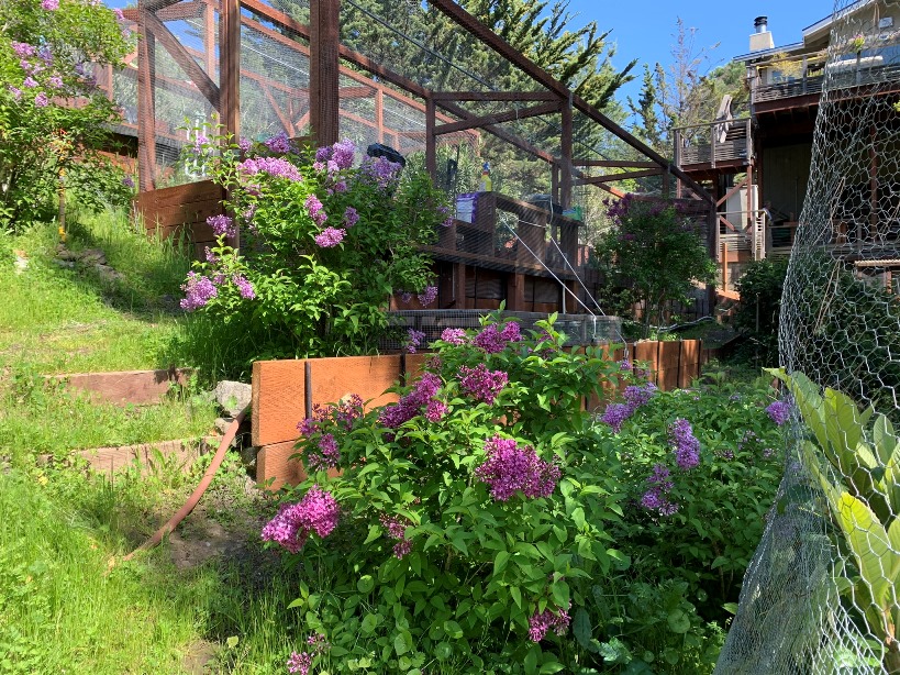 Lilacs in bloom - the little 'garage' - the third veggie garden - and what the moles did to our young fig tree's root